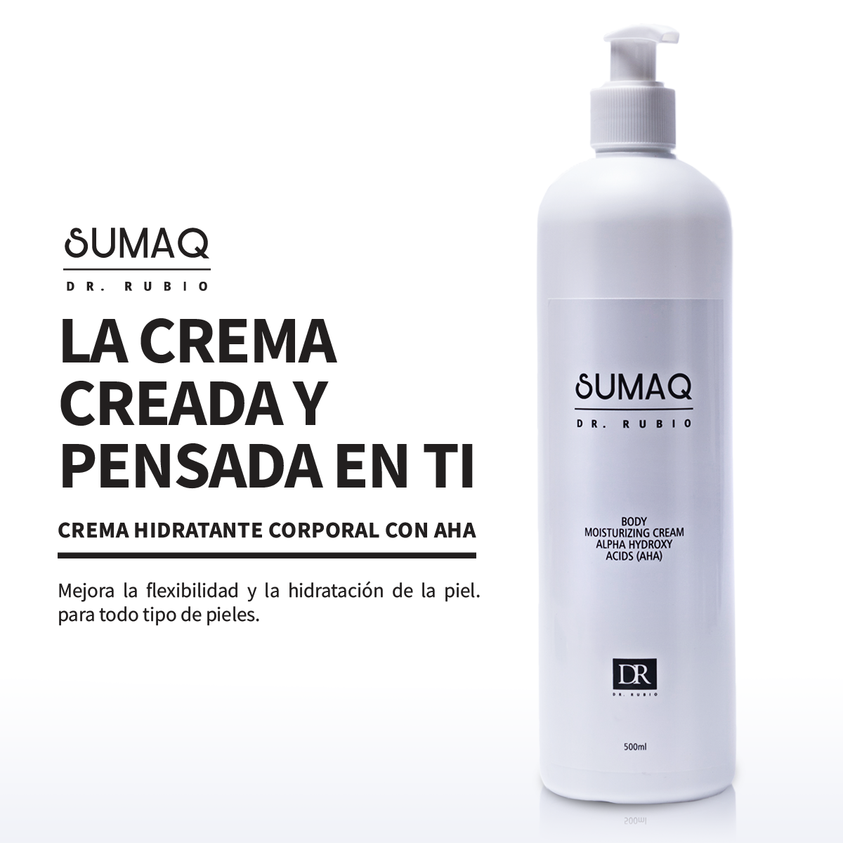 Nuestra Crema Hidratante Corporal Alfahidroxiacidos (AHA) - SUMAQ by Dr. Rubio nos ayudará a mejorar la flexibilidad y la hidratación de la piel. Para todo tipo de pieles.
